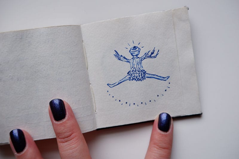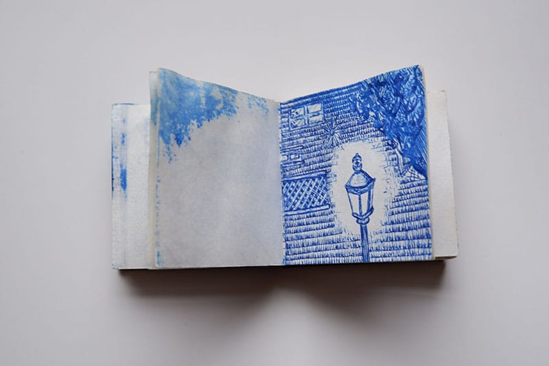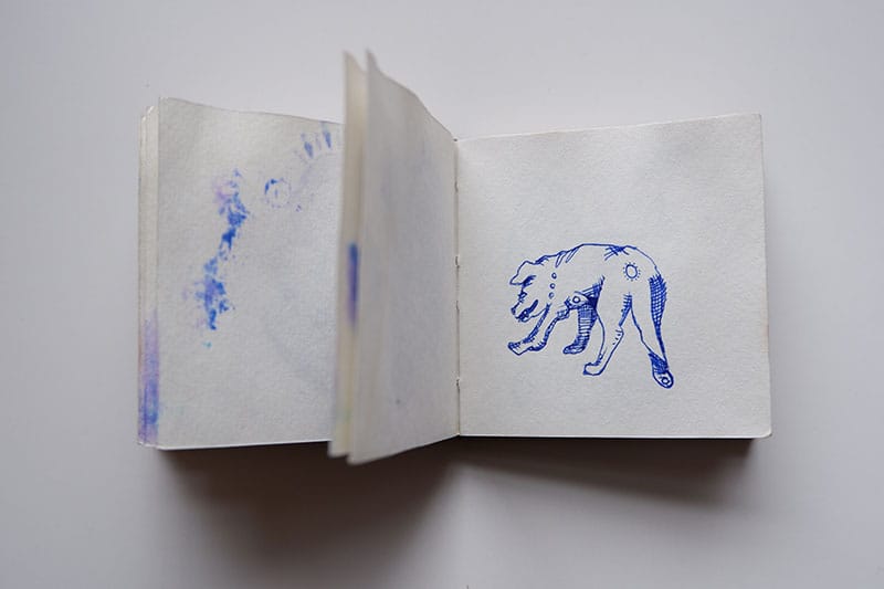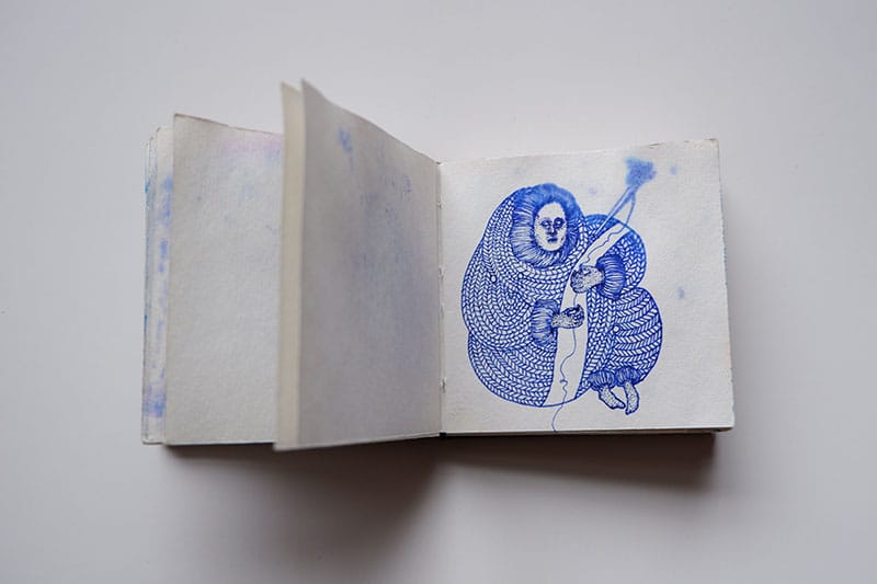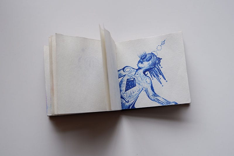 The first sketchbook that I'm sharing is from 2015. It's tiny - about three inches by three inches. I used exclusively blue gel pens - Pilot G2s - as I did for most of college.